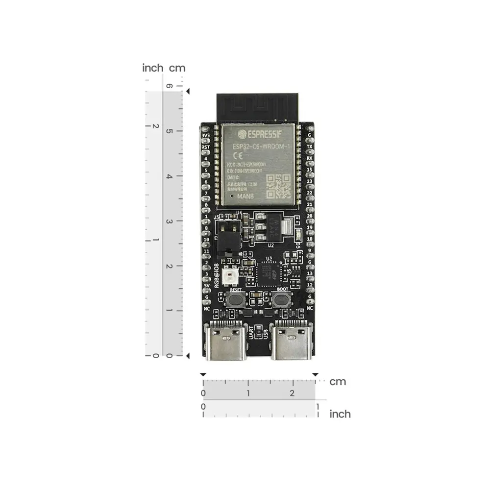Verschillende functies benadrukken de mogelijkheden en het gebruiksgemak van het board . De USB -naar-UART-brug maakt snelle gegevensoverdracht mogelijk – tot 3 Mbps – terwijl de ESP32-C6 USB Type-C-poort zorgt voor een comfortabele voeding en communicatie. Deze poort is ontworpen om USB 2.0 op volle snelheid te ondersteunen met overdrachtssnelheden tot 12 Mbps. Voor eenvoudige visuele feedback is het board voorzien van een adresseerbare RGB-led, aangestuurd door GPIO8, om de status display of gegevens visueel weer te geven in levendige kleuren.