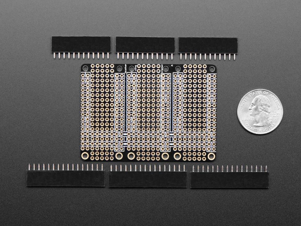 De minikit bevat een Tripler Wing PCB en drie sets female feather headers . De Tripler beschikt over drie breakouts voor elke pin op een feather , samen met een raster van proto-gaten, wat flexibele ontwerpopties biedt.