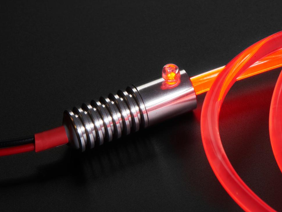Licht in de glasvezelkabel zoeft door de kern door constant te weerkaatsen op de rand van het gegoten plastic, een principe dat "totale interne reflectie" wordt genoemd (wat ook klinkt als een heel duur meditatie-eiland). Wanneer de lichtgeleider geen totale reflectie heeft, kun je een mooi lichteffect creëren doordat het licht de plastic buis verlicht. Het enige wat je nodig hebt, is een manier om een heleboel fotonen in je lichtgeleider te krijgen, en dat is wat dit is! Het is een glasvezel lichtbron in een vurige rode kleur.