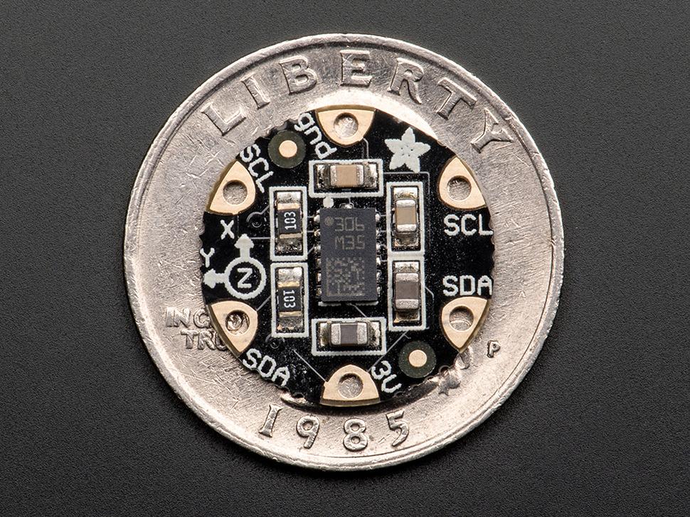 Voeg bewegings- en richtingsdetectie toe aan uw draagbare FLORA-project met deze uiterst nauwkeurige 3-assige accelerometer + kompassensor. De ingebouwde accelerometer bepaalt de richting van Gravity en measures de versnelling in 3D, terwijl de magnetometer de sterkste magnetische kracht detecteert en u helpt het magnetische noorden te vinden.