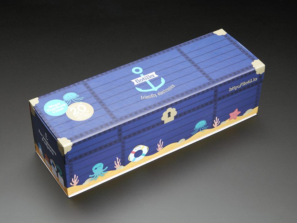 De Mega Treasure Chest Starter Kit is de ultieme Flotilla-set, inclusief 14 modules. Deze modules ondersteunen projecten zoals een Noisemaker-synth, sfeerverlichting en een lijnvolgende robot, naast acht eenvoudige recepten uit het kookboek voor snelle starts.