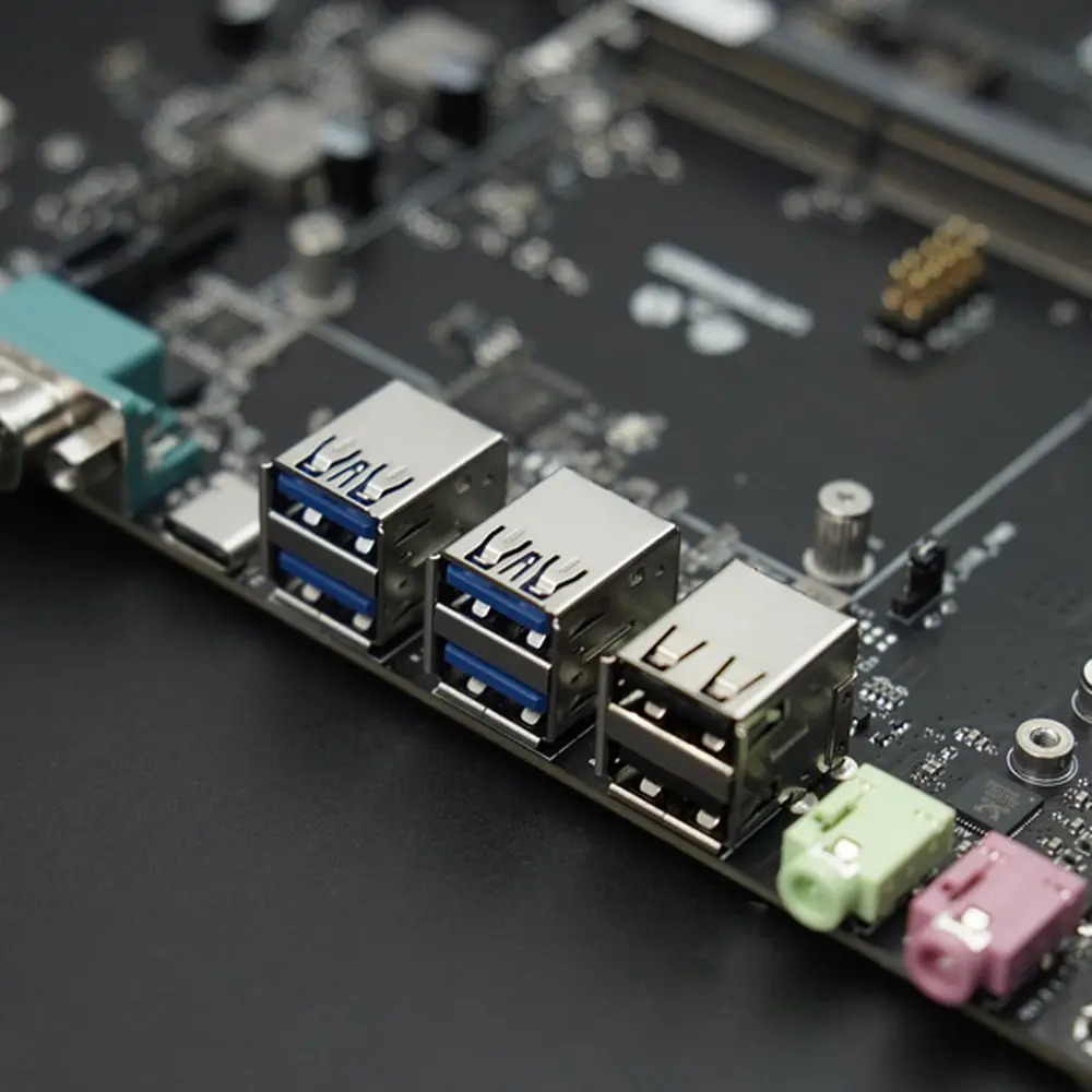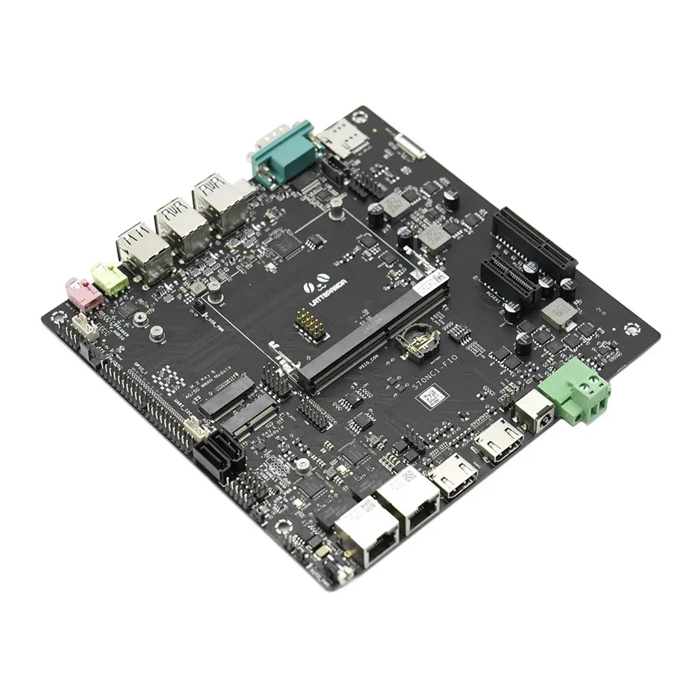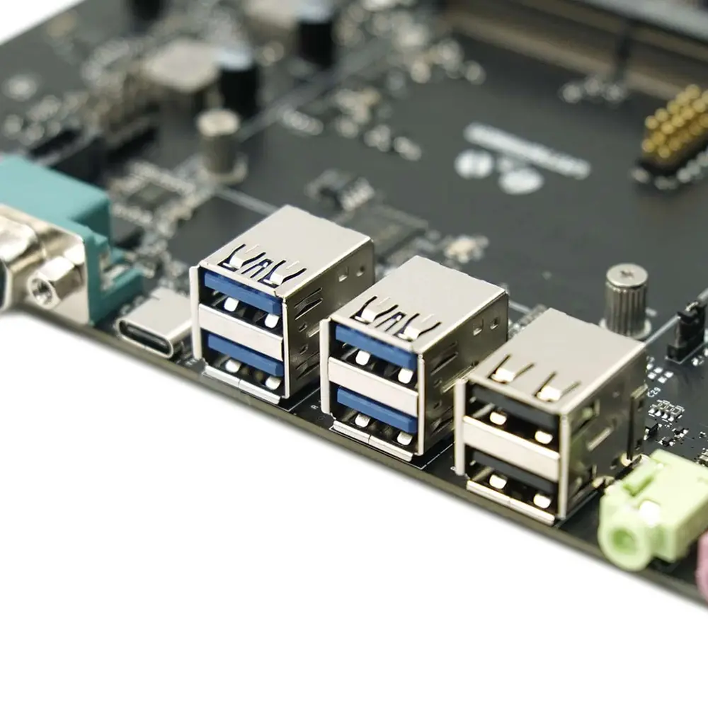 Het board biedt volledige pinblootstelling en is uitgerust met 4 USB 3.0-poorten, 2 Intel I225 2.5G-netwerkpoorten en 2 HDMI 2.0-poorten. Het beschikt over twee M.2-slots, waaronder een M.2 E- en een M.2 B-slot, voor eenvoudige integratie van wifi-kaarten of mobiele datakaarten. Een standaard PCIe x1-slot en een PCIe x4-slot zijn inbegrepen voor flexibele uitbreiding van randapparatuur zoals grafische kaarten en geluidskaarten, waardoor het een universele oplossing is voor ontwikkelaars.