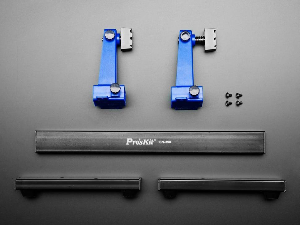 De ultra-verstelbare PCB-houder van Pro's Kit onderscheidt zich door zijn vermogen om moeiteloos zowel grote als kleine printplaten te plaatsen. Ideaal voor complexe soldeer- en desoldeerwerkzaamheden, garandeert hij een stabiele en efficiënte bediening. Ontworpen met vier sleuven voor verschillende PCB-diktes, garandeert deze houder een optimale pasvorm en stabiliteit.
