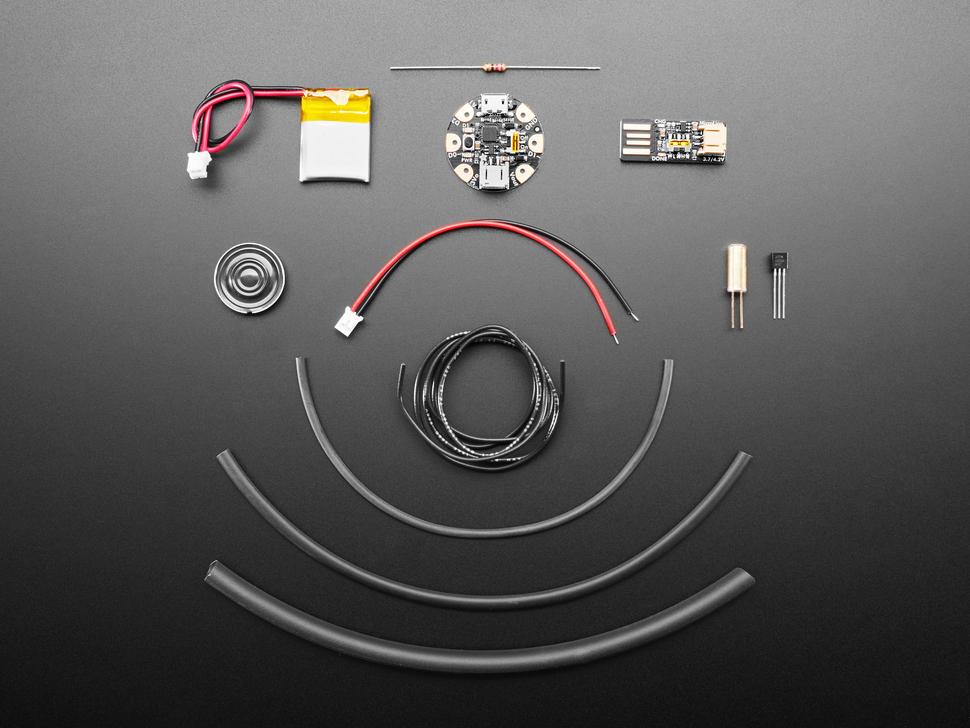 De kit bevat een Adafruit Gemma V2, een 3,7V 150mAh LiPoly-batterij, een kantelbalschakelaar, een Adafruit Micro Lipo USB LiIon/LiPoly-lader v2, een PN2222-transistor, een kleine luidspreker, een 220-ohm-weerstand, een 61 cm dikke massieve draad en drie krimpkousjes in verschillende maten voor veilige verbindingen. Let op: de pluchen uil is niet inbegrepen, maar je kunt er elk knuffeldier dat je in huis hebt mee opvrolijken!