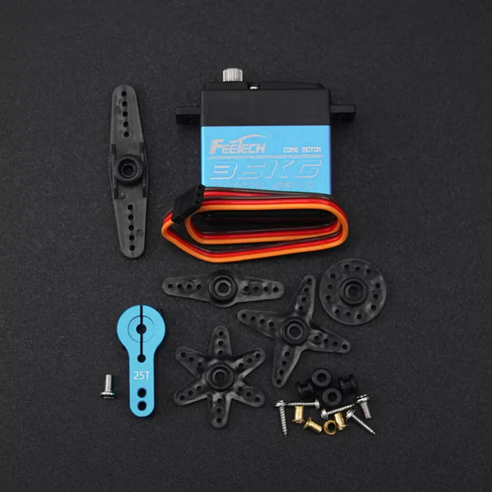 Om de hoge waterbestendigheid te behouden, zijn de verbindingen van de servo afgedicht met waterdichte pakkingen en is de board beschermd met waterdichte vernis. Bovendien zijn zowel de motor als de potentiometer vastgezet met speciale lijm. Deze verbeteringen zorgen ervoor dat de servo uitzonderlijk goed presteert onder verschillende omstandigheden. Hij wordt ook geleverd met een assortiment aan verschillende servohoorns, waardoor hij breed inzetbaar is voor diverse toepassingen.