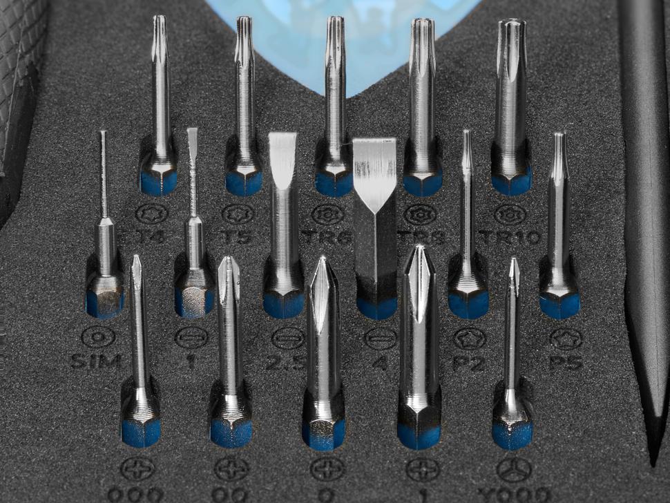De set bevat standaardonderdelen zoals een gemagnetiseerde driver en een gehoekte precisiepincet, naast speciaal gereedschap zoals zuignappen en spudgers. Deze gereedschappen maken het openen en onderhouden van moderne elektronica, zoals smartphones en tablets, een fluitje van een cent.
