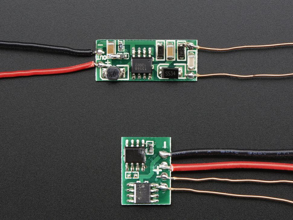 De vierkante board met twee chips is de zender: voorzie deze van 9 V. De langere board is de output en kan worden geïntegreerd in projecten die draadloze voeding nodig hebben.