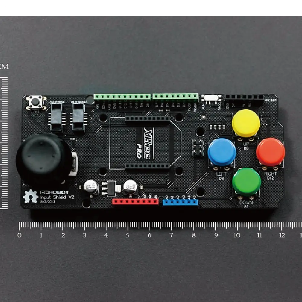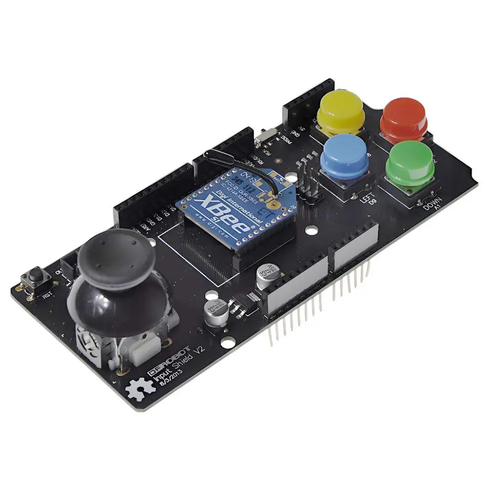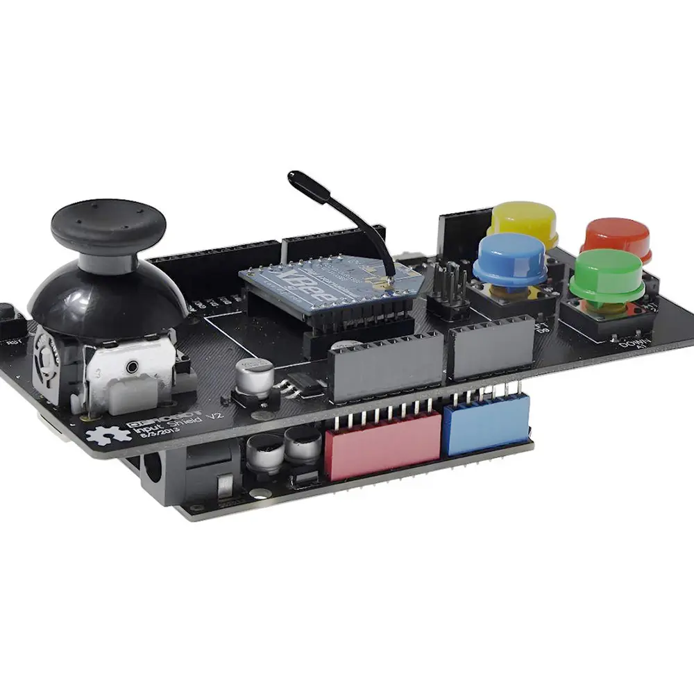 Het verbeterde Arduino Input shield verbetert je projecten met zijn intuïtieve bediening en veelzijdige connectiviteit. Met een tweeassige mini-joystick, compleet met een momentschakelaar, maakt dit shield nauwkeurige navigatie en selectie mogelijk, ideaal voor het besturen van robots of navigeren door menu's. Bij de joystick horen vier drukknoppen in de kleuren rood, geel, blauw en green , die extra invoeropties bieden voor diverse opdrachten of selecties.