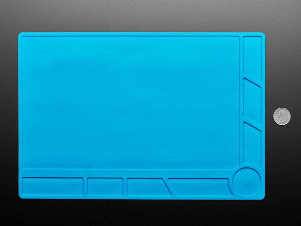 De siliconenmat is 34 cm bij 23 cm groot en heeft gegoten groeven voor het ordenen van soldeerpasta, schroeven, headers en kleine accessoires. Verkrijgbaar in blauw of doorschijnend, is dit veelzijdige gereedschap een ideale aanvulling op elke werkplek. Let op: de mat wordt los geleverd; soldeer, soldeerbout en andere onderdelen zijn niet inbegrepen.