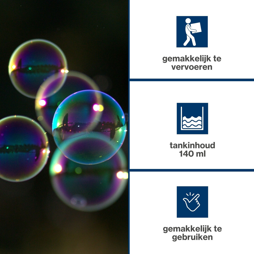 Verander elke gelegenheid in een zee van kleurrijke bubbels met deze handige bellenmachine. Klein en draagbaar, perfect voor zowel binnen als buiten!