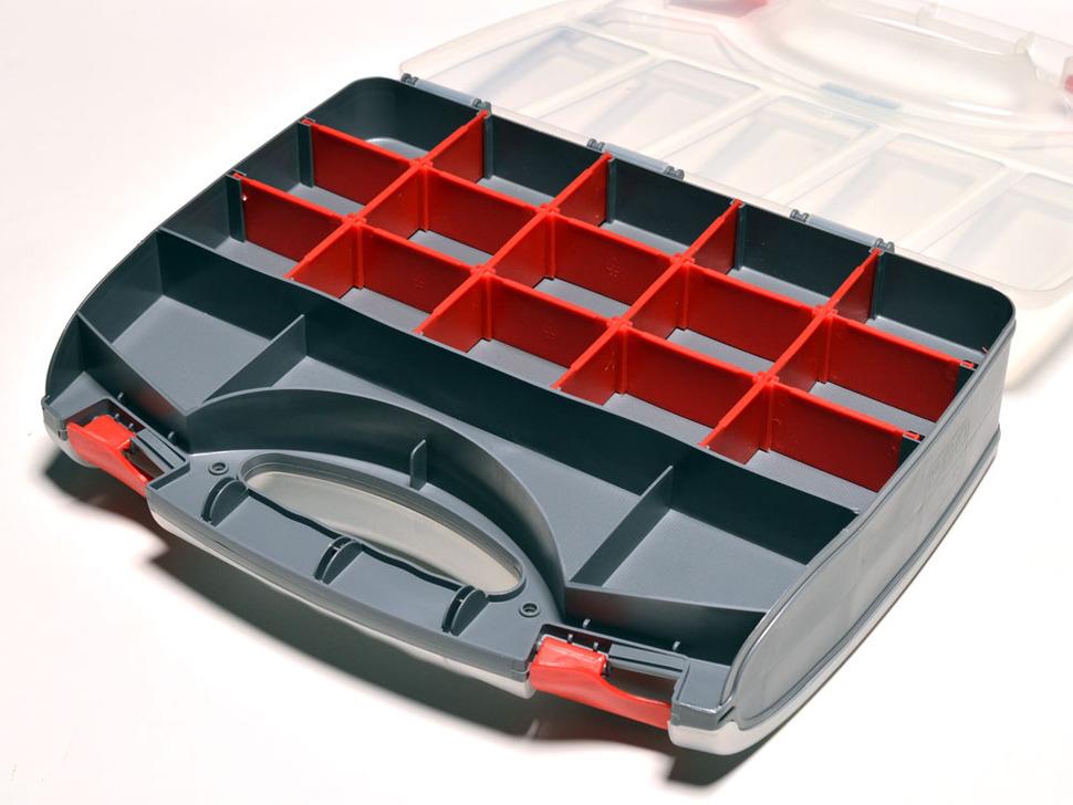 Aan de ene kant is er een traditioneel scheidingssysteem met 15 compartimenten met verstelbare verdelers, zodat u de ruimte naar wens kunt indelen. Elk compartiment is 6,6 x 4,8 x 3,2 cm, maar u kunt de compartimenten vergroten door verdelers te verwijderen.