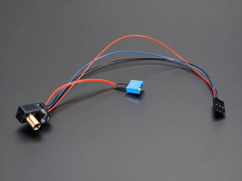 De installatie van dit apparaat is eenvoudig: sluit 5 V DC aan op de rode draad (let op: 3 V is niet voldoende), ground de zwarte draad en bevestig een pullup-weerstand aan de output . Deze weerstand kan op vrijwel elke gewenste spanning worden aangesloten. Wanneer de lichtbundel wordt onderbroken, aardt de blauwe output zichzelf. Zonder obstakels blijft deze hoog, wat duidt op een ononderbroken lichtbundel. Hoewel instelbaar, heeft de ingebouwde potentiometer minimale invloed op de gevoeligheid.