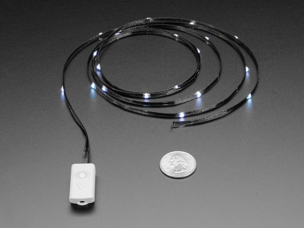 Dit zachte stoffen lint is voorzien van kleine, op het oppervlak gemonteerde leds die naadloos verbonden zijn met twee geleidende draden over de lengte van het lint. Elke strip van 1,5 meter bevat 20 gelijkmatig verdeelde witte leds, wat een ultraflexibele en elegante manier creëert om elk draagbaar project te verlichten.