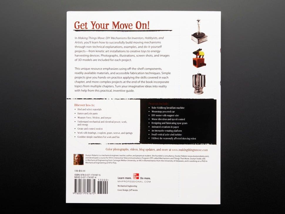 Making Things Move is een uitgebreide gids die mechanisch ontwerp demystificeert en toegesneden is op mensen zonder technische achtergrond. Aan de hand van boeiende voorbeelden worden principes uitgelegd zoals het koppelen van bevestigingen, het omzetten van bewegingstypen en het gebruik van lagers en tandwielen.