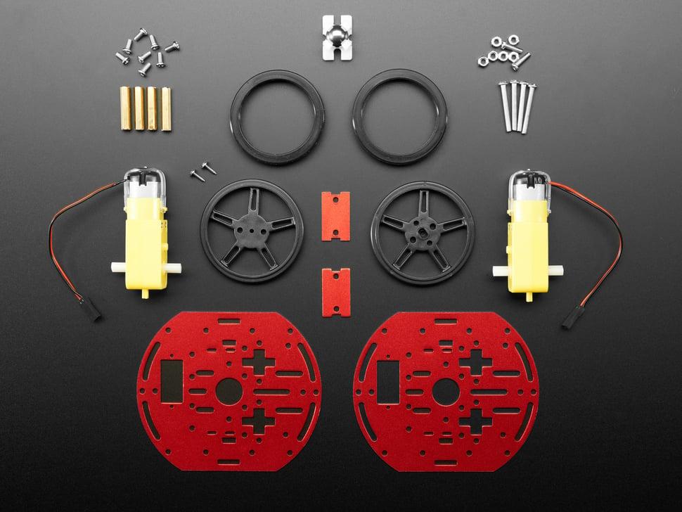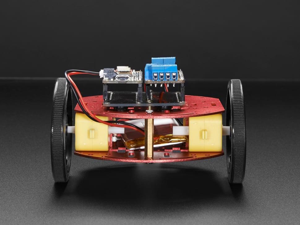 Gebruik een voeding, board en motorcontroller om je creatie te personaliseren. Geschikte suggesties voor motoren zijn onder andere de TB6612 breakout en het shield voor Arduino . De feather 32u4 Bluefruit LE kan worden gebruikt om de wielen te besturen, met stroomvoorziening via een compatibele lithium-ionbatterij, zoals de 3,7V 2000mAh-optie. Let op: de batterij, board feather en de accessoires zijn niet inbegrepen in de kit.
