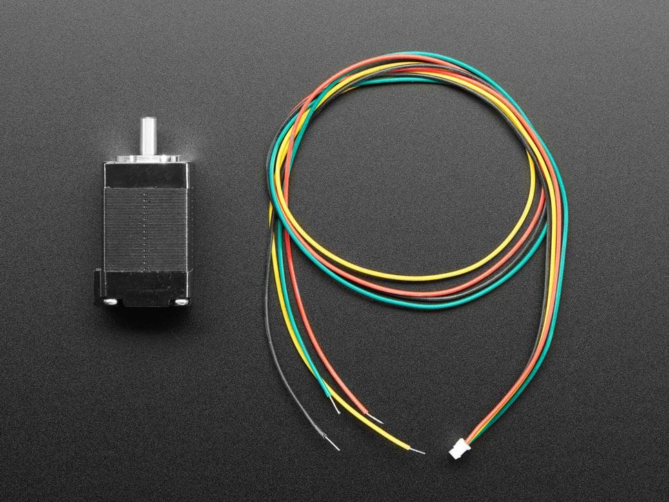 De voorgemonteerde kabel vereenvoudigt de installatie, maar let op: de kleuren van de draden kunnen variëren. Voor green /zwarte/gele/rode motoren: sluit aan als zwart, rood, green , geel; voor gele/rode/oranje/blauwe motoren: sluit aan als rood, blauw, geel, oranje. Getest met een Adafruit shield voor Arduino : de motor draait soepel met 50 toeren per minuut.