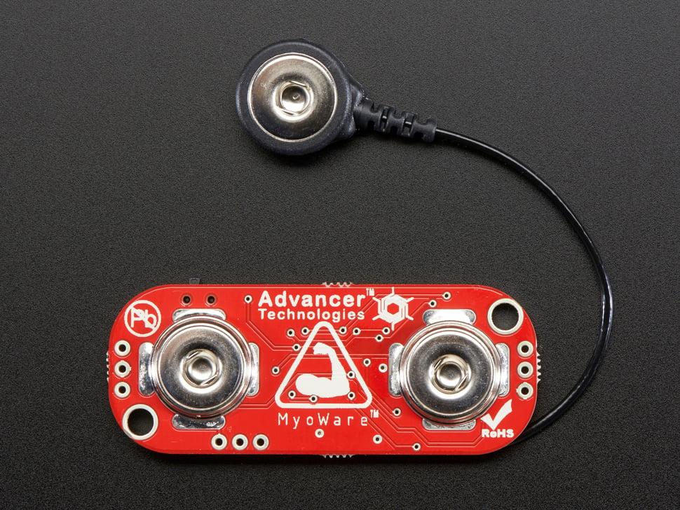 Elektromyografie is een elektrodiagnostische geneeskundige techniek voor het evalueren en registreren van de elektrische activiteit geproduceerd door skeletspieren. Gebruik deze sensoren in protheses, robotica en nog veel meer! Zodra u de sensor aan een grote spier (zoals uw biceps) hebt bevestigd, kunt u de signaalpiek buigen en meten als een analoge spanning.