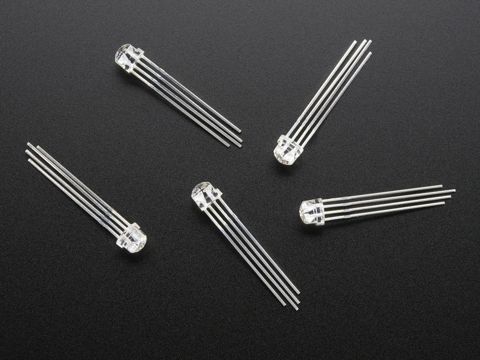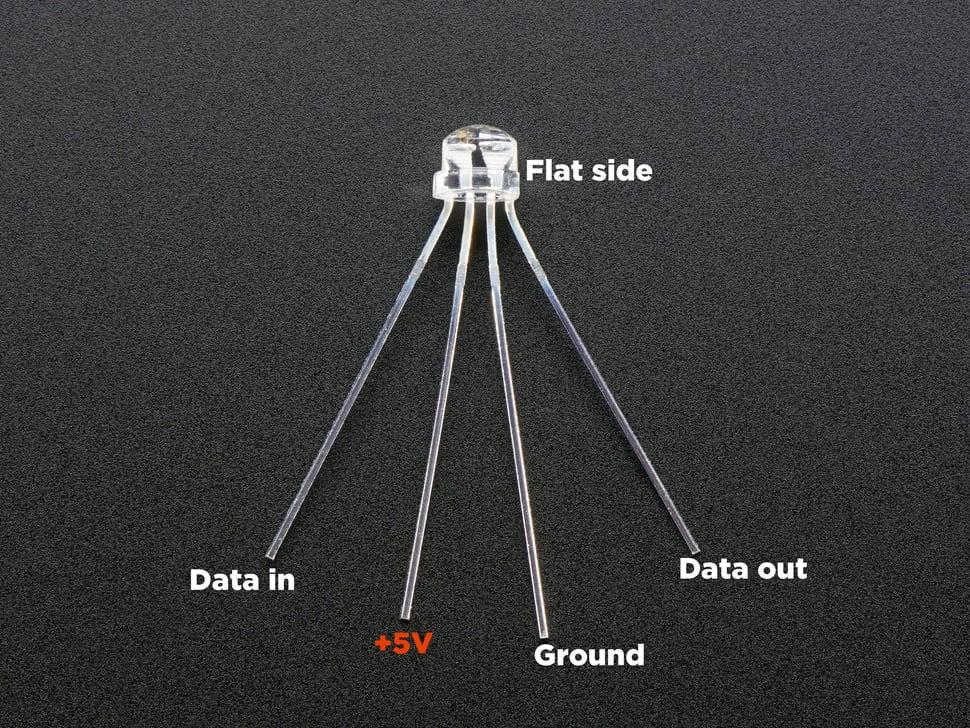 Oh ja, we hebben 5mm through-hole NeoPixels! Deze leds bieden de veelzijdigheid van NeoPixel-strips in een breadboard -vriendelijk formaat. Elke led ziet eruit als een traditionele 5mm RGB-led met 4 pootjes, maar heeft een ingebouwde chip voor snelle PWM-regeling, wat 24-bits kleuren mogelijk maakt.
