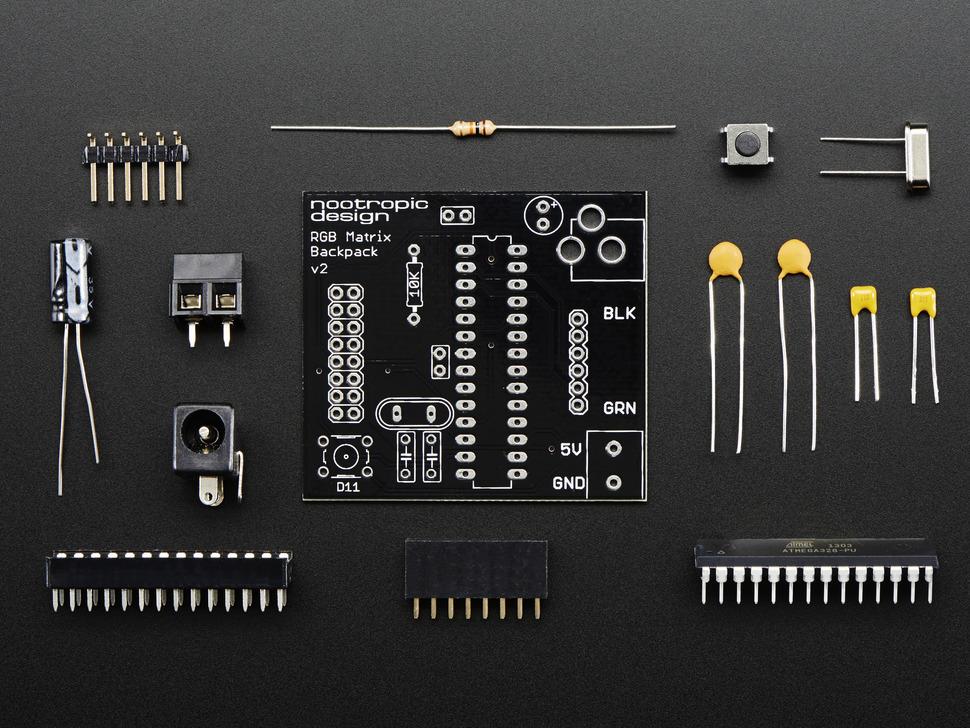 De voorgeïnstalleerde ATmega328-chip biedt een basisanimatie die eenvoudig kan worden aangepast met Adafruit libraries , die te downloaden zijn van de Matrix-tutorialpagina. Hoewel montage vereist is, is het proces intuïtief voor degenen die bekend zijn met het gebruik van Arduino board .