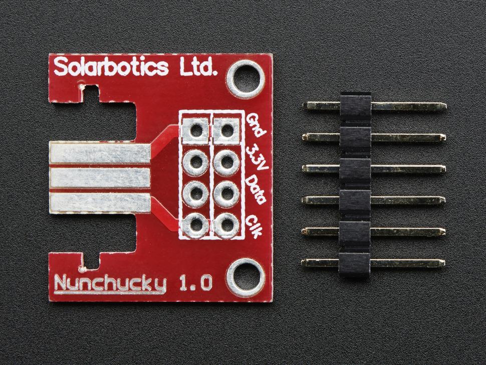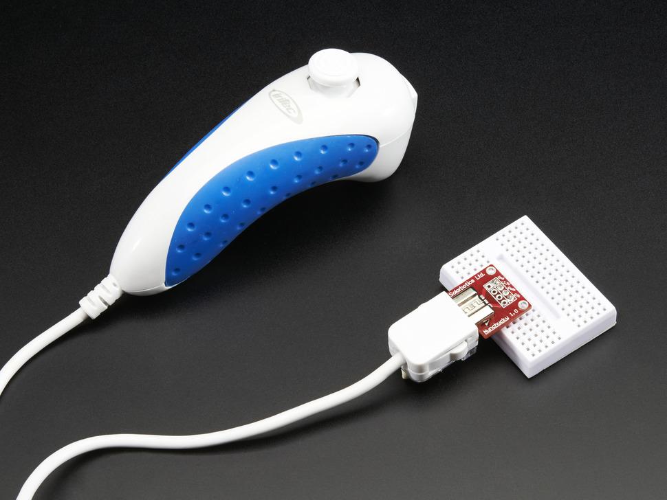 De Wii Nunchuck combineert schakelaars, een joystick en een accelerometer in één compact apparaat. Vergroot de veelzijdigheid met de Solarbotics Nunchucky breakout board , waardoor het niet nodig is om connectoren aan te passen.
