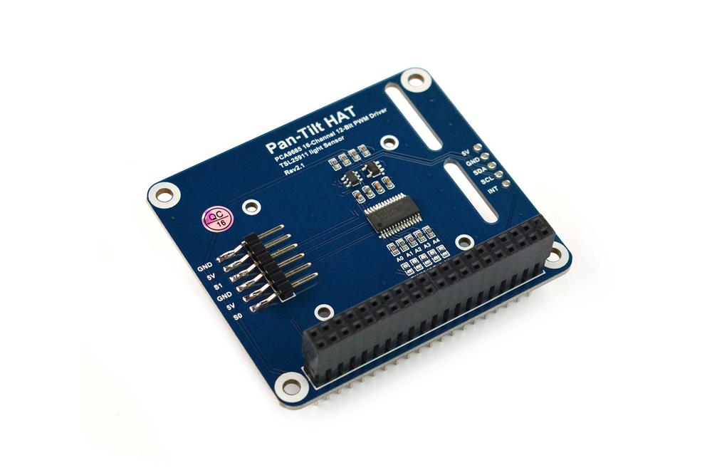Deze 2-DOF pan-tilt hat is een geavanceerde accessoire voor Raspberry Pi en Jetson Nano, die naadloze controle over camerabewegingen en lichtintensiteitsdetectie mogelijk maakt via een I²C-interface, met slechts twee signaallijnen. De module is voorzien van een board PCA9685-chip, die een PWM- output met een resolutie van 12 bits levert voor nauwkeurige pan-tilt rotatie, wat nauwkeurige monitoring of tracking mogelijk maakt in combinatie met een compatibele camera.