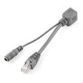 De passieve PoE-kabelset is aan de ene kant voorzien van een female RJ45, aangepast aan een male RJ45 en aan de andere kant een 5,5x2,1 mm holle jack-connector. De 'injector'-kabel is voorzien van een female jack-connector, terwijl de 'splitter'-kabel een male jack-jack bevat. Voor gebruik sluit u eenvoudigweg de kabels aan elk uiteinde van uw netwerkkabel aan, sluit u de male stekker van de splitter aan op uw doelapparaat en sluit u uw voedingsadapter aan op de injector. Deze opstelling maakt het gebruik van één enkele kabel mogelijk om zowel stroom als gegevens te leveren voor uw Ethernet-apparaat.