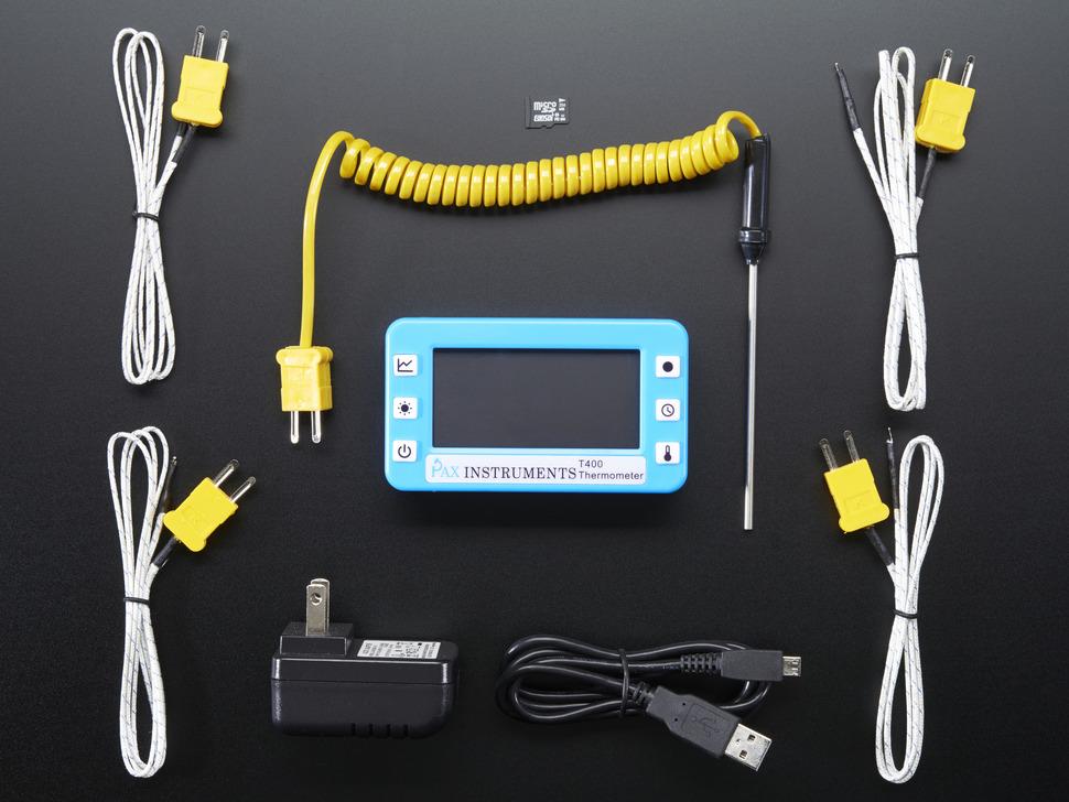 De set bestaat uit een T400-temperatuurdatalogger, een vooraf geïnstalleerde BL-5C-batterij, een thermokoppel met roestvrijstalen sonde, thermokoppels met meerdere draden, USB wandlader, een MicroUSB-kabel en een MicroSD-kaart van 256 MB. Daarmee beschikt u over een uitgebreid pakket voor effectief beheer van temperatuurgegevens.