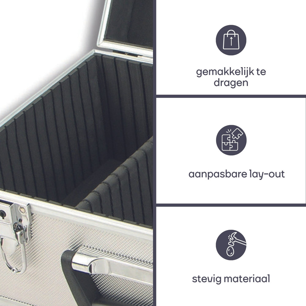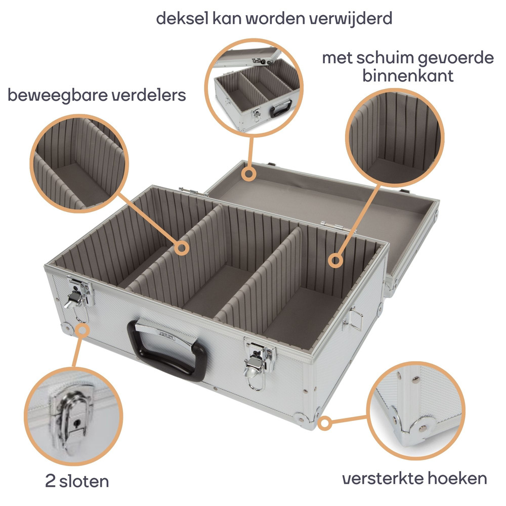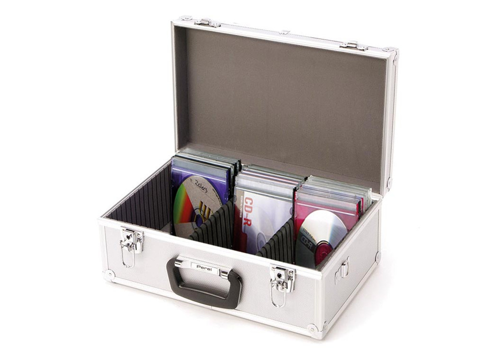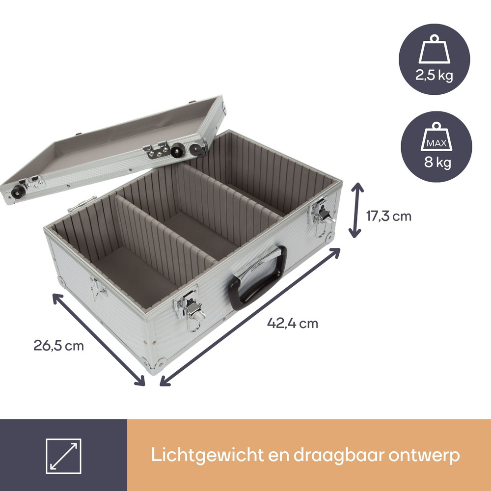 De Perel aluminium cd-koffer, met afmetingen van 424 x 265 x 173 mm en een capaciteit van 19,4 L, bergt efficiënt tot 60 cd's op. Lichtgewicht maar stevig, de verstevigde hoeken zorgen voor extra duurzaamheid.