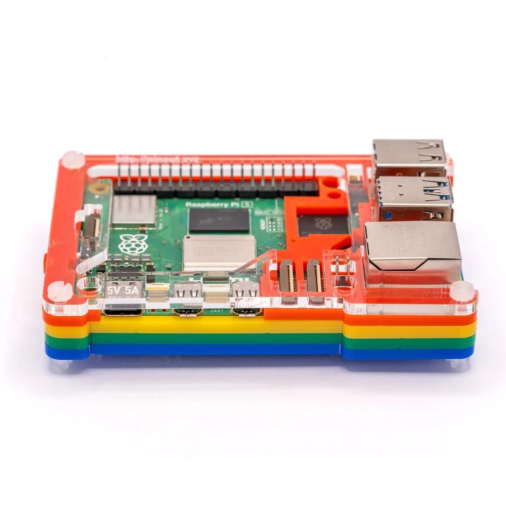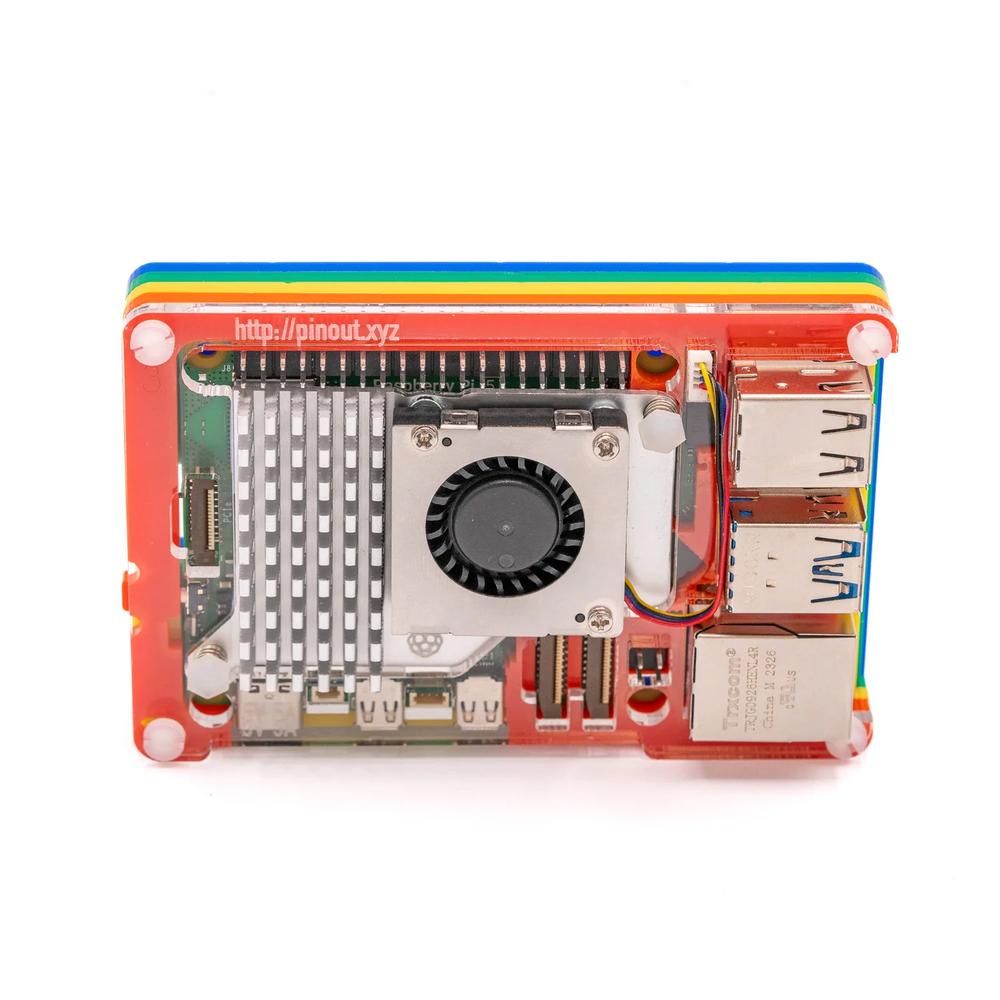 Pibow 5 is verkrijgbaar in drie levendige kleuren: Ninja (transparant zwart), Royale (transparant paars) en Rainbow (ondoorzichtig regenboog). Let op, de Raspberry Pi 5 en de Active Cooler zijn niet inbegrepen en de Pibow is momenteel niet compatibel met de NVMe Base of NVMe Base Duo, maar er wordt aan een oplossing gewerkt.