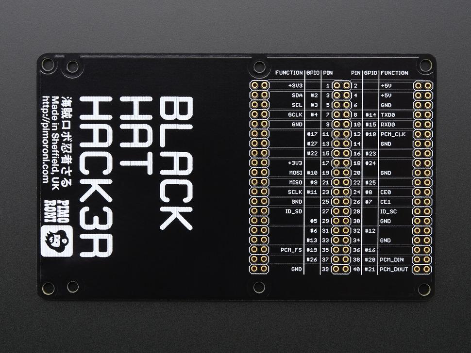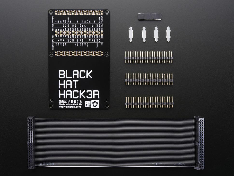 De kit bevat de Black hat Hack3r PCB, een 40-polige zwarte GPIO-lintkabel, drie 40-polige headers , vier PCB-afstandhouders voor hat -montage en vier rubberen antislipvoetjes. Houd er rekening mee dat Raspberry Pi en hat niet zijn inbegrepen.