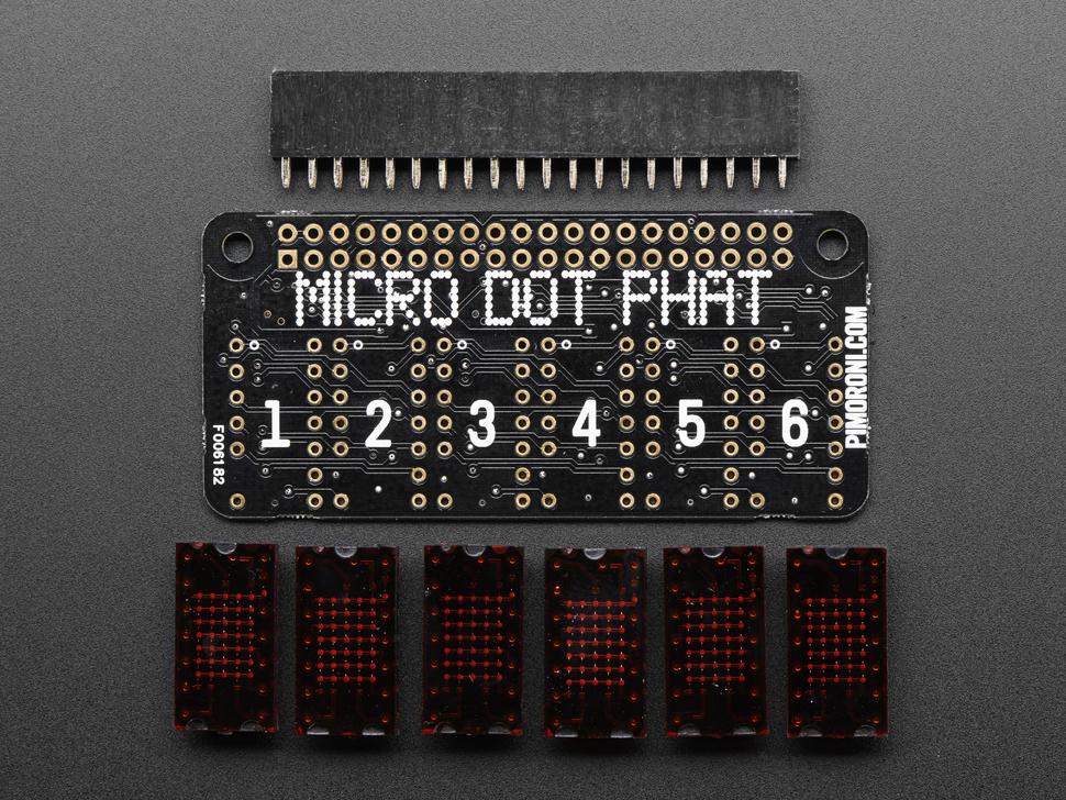 De functies omvatten drie ingebouwde IS31FL3730 LED- driver en compatibiliteit met alle 40-pins Raspberry Pi varianten. De behuizing bestaat uit een geassembleerde Micro Dot pHAT-printplaat, een 2x20 GPIO- header en zes rode LTP-305 LED-modules.