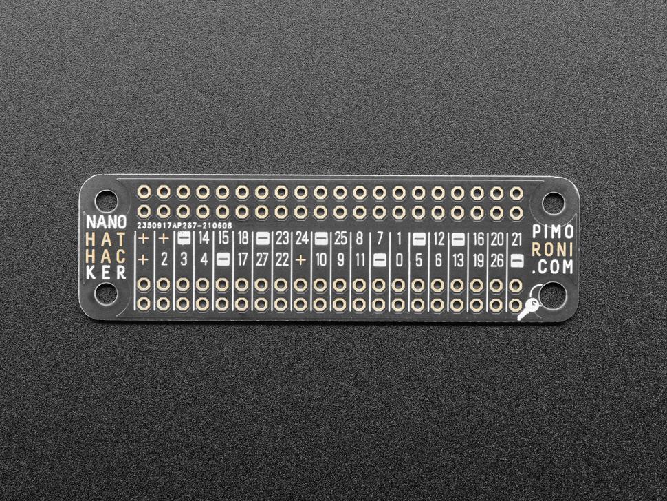 Voorheen bekend als de "Pico hat Hacker", vermindert de naamswijziging naar "Nano" de verwarring met het Raspberry Pi Pico board , zonder de robuuste functionaliteit te veranderen. Elke pin is handig gelabeld, met BCM-pinnummering aan de ene kant en meer beschrijvende labels aan de andere kant, die de I²C-, UART-, SPI-, PWM- en I²S-pinnen aangeven.