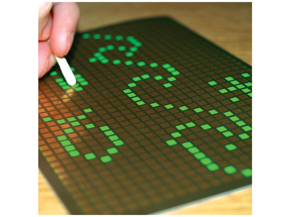 Analoog en digitaal smelten samen tot een interactieve winnaar met dit innovatieve product. Kras de gouden folie weg om green pixels te onthullen, zodat je je eigen unieke berichten en afbeeldingen kunt creëren.