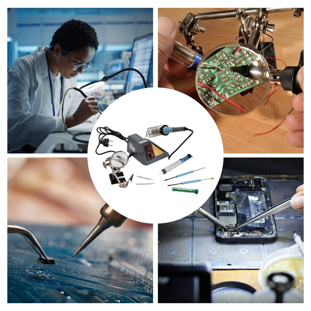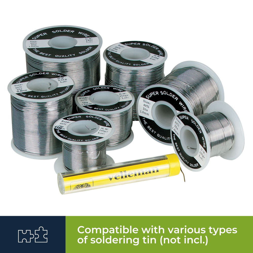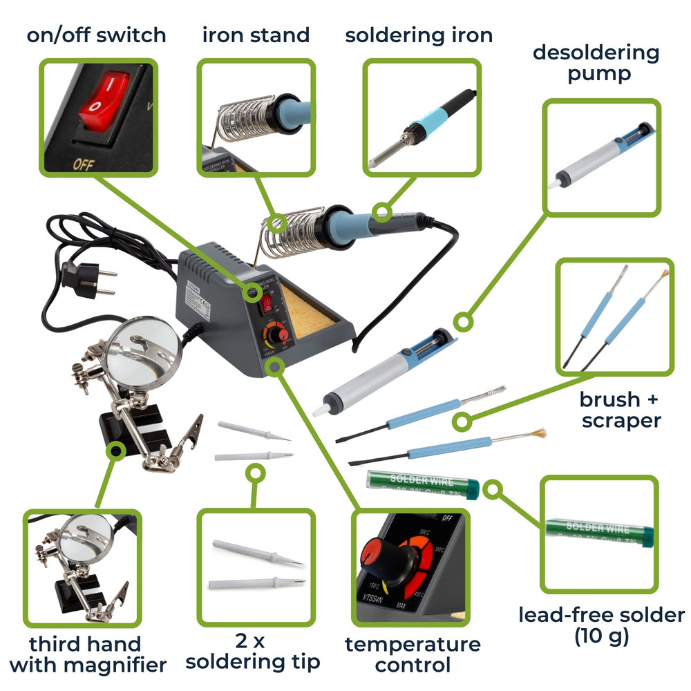Profiteer van een scala aan accessoires, waaronder een derde hand met een vergrootglas, een desoldeerpomp, loodvrij soldeer (10 g) en veelzijdige soldeergereedschappen zoals borstels en schrapers, die het solderen moeiteloos verbeteren.