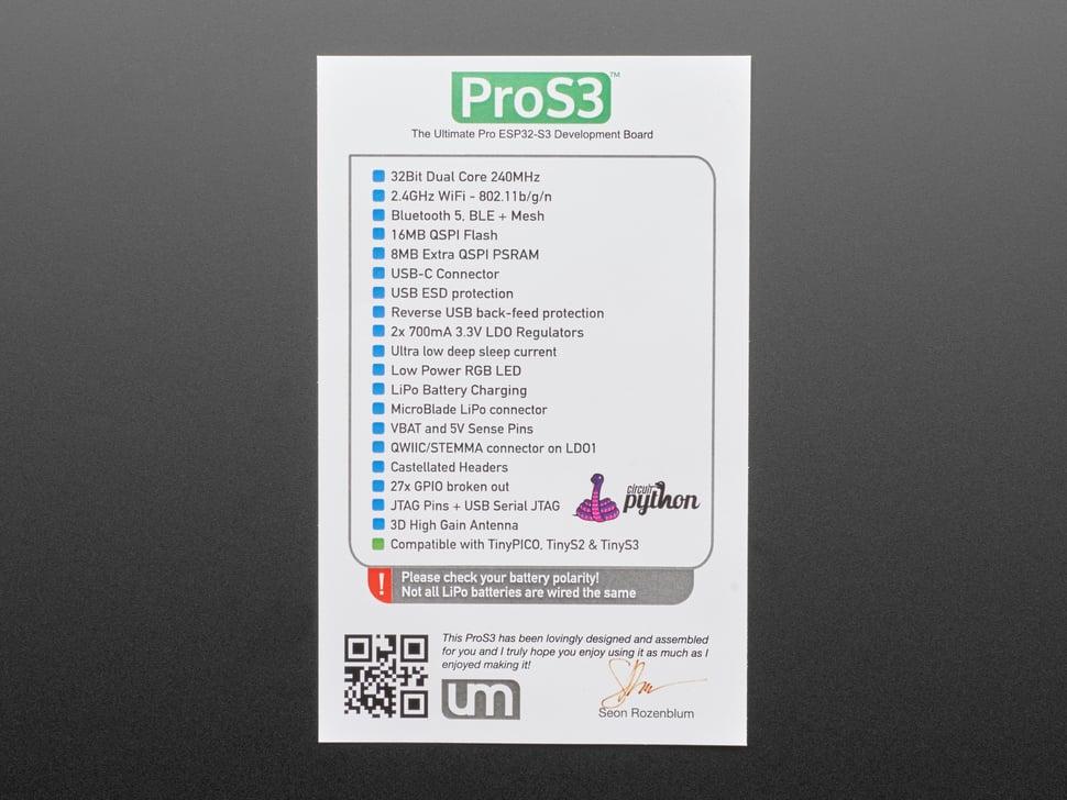 De ProS3 ESP32-S3 Development Board biedt een moeiteloze programmeerervaring met de vooraf geïnstalleerde CircuitPython en UF2 bootloader. Je hoeft alleen maar via USB te verbinden, en hij verschijnt als een flashdrive, waardoor je meteen kunt beginnen met coderen en updaten.