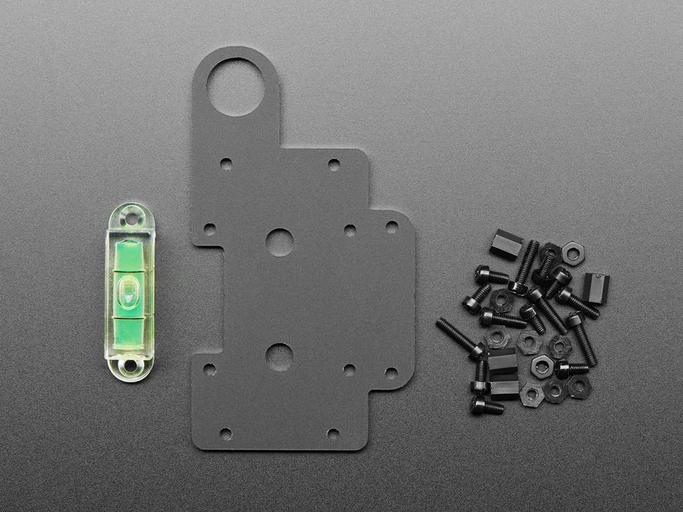 Inhoud van de set: 1 x montageplaat, 4 x 6 mm female - female nylon afstandhouders, 8 x M2,5 nylon moeren, 8 x 5 mm M2,5 nylon schroeven, 4 x 10 mm M2,5 nylon schroeven, waterpas, 2 x 8 mm M2,5 nylon schroeven, 2 x M2,5 nylon moeren. We leveren ook een montageplaat voor de Raspberry Pi 4/3 B+.