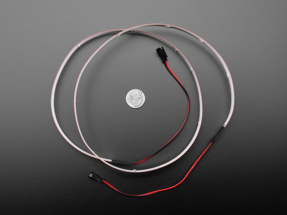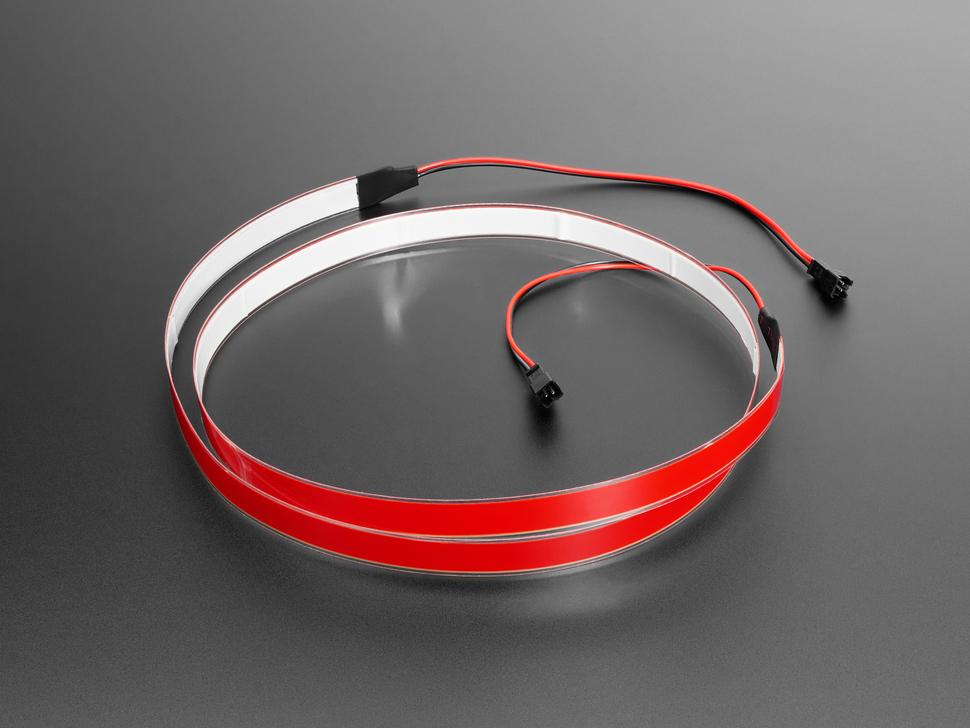 Deze tape vereist een krachtigere omvormer dan EL-draad en wordt geleverd in lengtes van 100 cm met connectoren aan beide uiteinden, waardoor hij gemakkelijk in twee afzonderlijke stukken kan worden geknipt en gebruikt. Houd er rekening mee dat een 2xAA-zakomvormer slechts een lengte van 60 cm kan voeden, terwijl een 4xAAA-omvormer de volledige meter aankan.