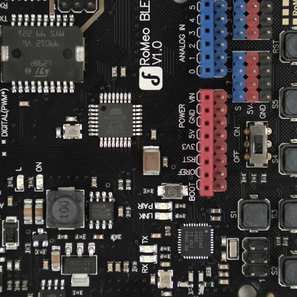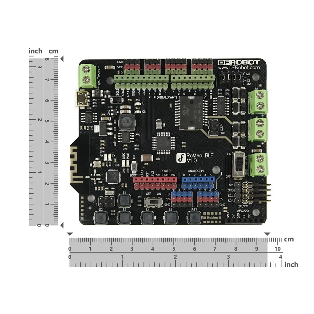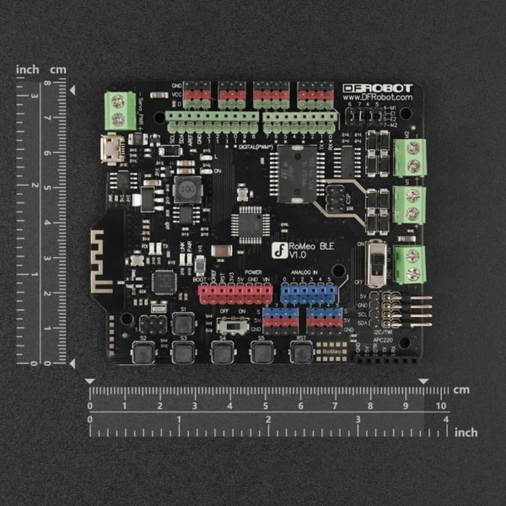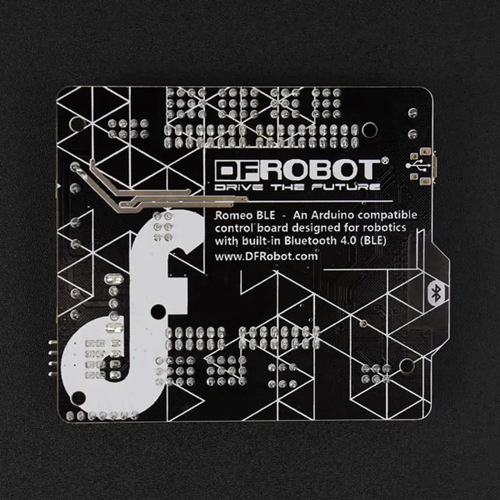 De Romeo BLE, een nieuw lid van de Romeo-familie, behoudt alle functies van de Romeo all-in-one controller en integreert Bluetooth 4.0 voor een moeiteloze installatie. Met Bluetooth 4.0 ondersteunt de Romeo BLE het draadloos uploaden van schetsen, waardoor er geen kabel nodig is om nieuwe code te uploaden. Een USB Bluno Link-adapter zorgt ervoor dat de Romeo BLE updates draadloos kan ontvangen, wat het onderhoud en de upgrade van uw robotprojecten vereenvoudigt.