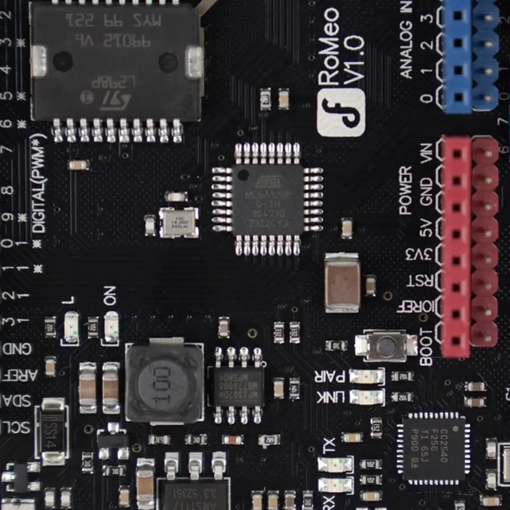 De Romeo-familie vertegenwoordigt een alles-in-één Arduino -gebaseerd board , speciaal ontwikkeld voor roboticatoepassingen door DFRobot . Door gebruik te maken van het open-sourceplatform Arduino , profiteert het van de ondersteuning van duizenden open-sourcecodes en kan het naadloos worden geïntegreerd met Arduino shields . De ingebouwde tweeweg DC motor driver en draadloze socket stellen u in staat om uw robotproject direct te starten zonder dat u een extra motor driver nodig hebt.