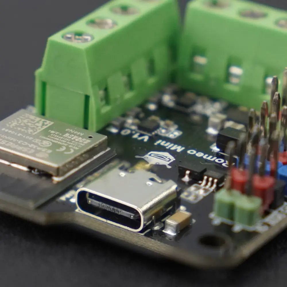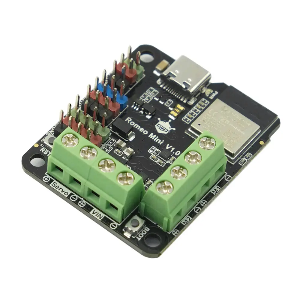 De Romeo Mini ESP32-C3 Robot Control board is een geavanceerde oplossing voor robotica-enthousiastelingen en biedt geïntegreerde motor driver in een compacte vorm. Uitgerust met een ingebouwde ESP32-C3-module biedt het moeiteloze wifi- en Bluetooth 5 dual-mode communicatie, wat de connectiviteit en besturing verbetert. Deze compacte board is ontworpen voor naadloze integratie met zowel servo's als motoren, waardoor het een uitzonderlijk hulpmiddel is voor diverse robotica-projecten.