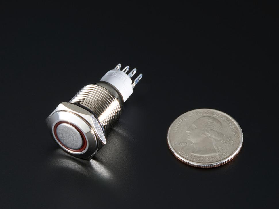 De achterkant is voorzien van een platte metalen actuator met een felrode plastic led-ring en drie contacten voor de functies van de knop – normaal, normaal open en normaal gesloten – en twee voor de voeding van de led-ring. De led licht prachtig op bij 3 tot 6 V dankzij een geïntegreerde weerstand. Voor hogere spanningen zoals 12 V of 24 V kunt u een weerstand van 470 ohm toevoegen om uw circuit te beveiligen.