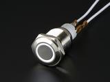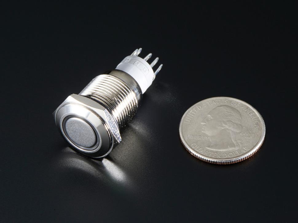 De voorkant is voorzien van een platte metalen actuator, omhuld door een witte plastic led-ring. Aan de achterkant bevinden zich drie contacten voor gemeenschappelijke, normaal open en normaal gesloten aansluitingen, plus twee voor de voeding (+ en -) van de led-ring. Laat de led oplichten met een 3 tot 6V-bron, gebruikmakend van de ingebouwde weerstand, of voeg een weerstand van 470 ohm toe voor 12V- of 24V-aansluitingen om een stroomsterkte van 20 mA te behouden.