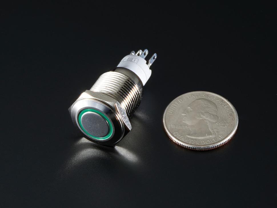 De voorkant is voorzien van een slanke, platte metalen actuator, omgeven door een green led-ring. De achterkant heeft drie schakelcontacten (gemeenschappelijk, normaal open en normaal gesloten) en twee voor de led-ring (+ en -). Een ingebouwde weerstand zorgt ervoor dat de led helder oplicht met een spanning van 3 tot 6 V. Voor hogere spanningen zoals 12 V of 24 V kunt u eenvoudig een weerstand van 470 ohm gebruiken om een optimale led-stroom te behouden.