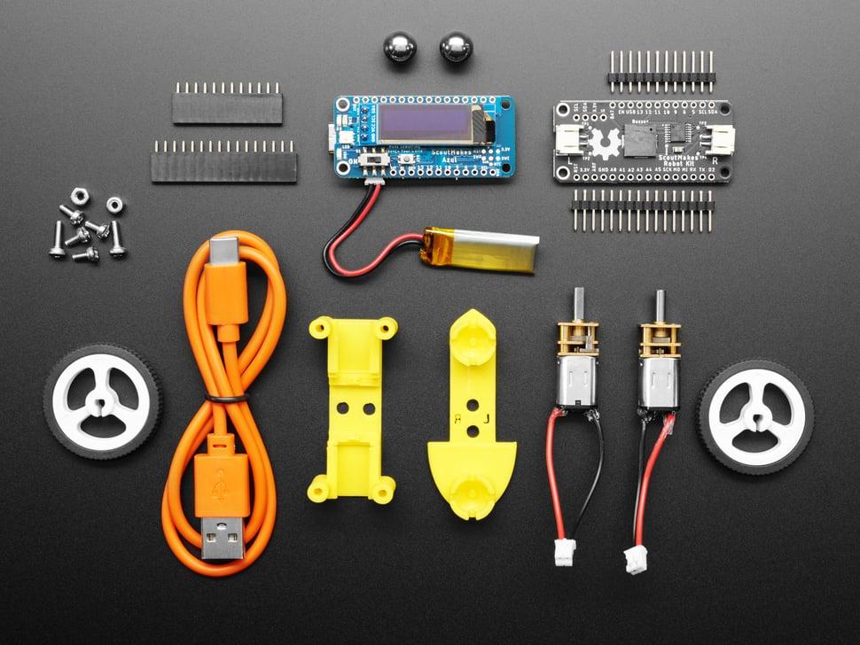 Met deze kit kun je een eenvoudige robot met wielen bouwen en tegelijk iets leren over mechanische montage en motorbesturing. Hij heeft een piëzo-elektrische zoemer en NeoPixels voor geluidseffecten en lichtshows terwijl je robot door zijn omgeving beweegt.