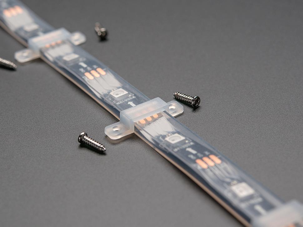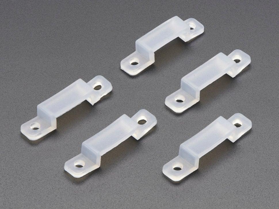 Bevestig flexibele NeoPixel-strips stevig met deze siliconenrubberen clips, ontworpen voor moeiteloze bevestiging aan muren, sierlijsten of projecten. Schuif de strip eenvoudig door de clips en positioneer ze handig tussen twee leds voor een optimale plaatsing. Elke verpakking bevat 5 duurzame clips voor meerdere installaties.