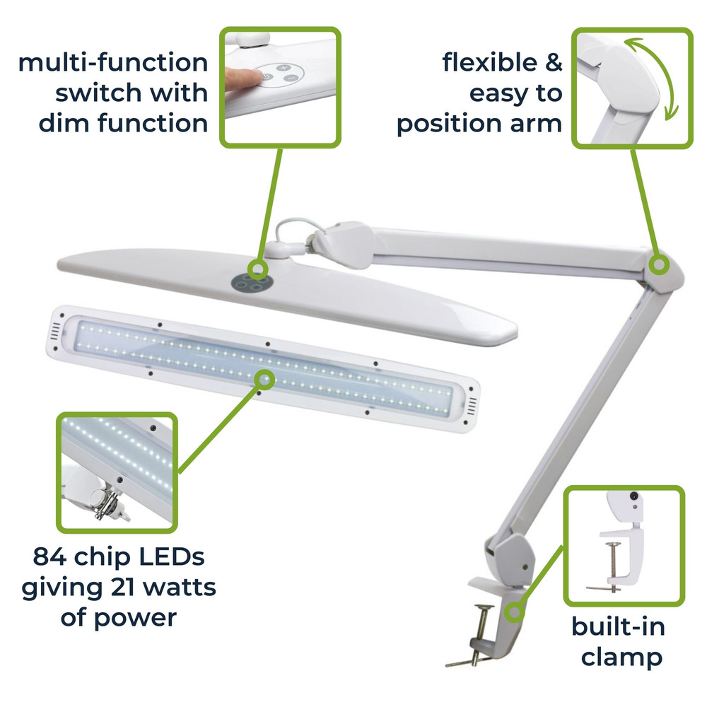 De LED-bureaulamp combineert functionaliteit met een strak design en biedt een moderne verlichtingsoplossing voor elke werkplek. Met een krachtige output van 21 W en 84 SMD-LEDs levert hij helder en precies licht bij 6500 Kelvin, perfect voor taken die precisie vereisen.