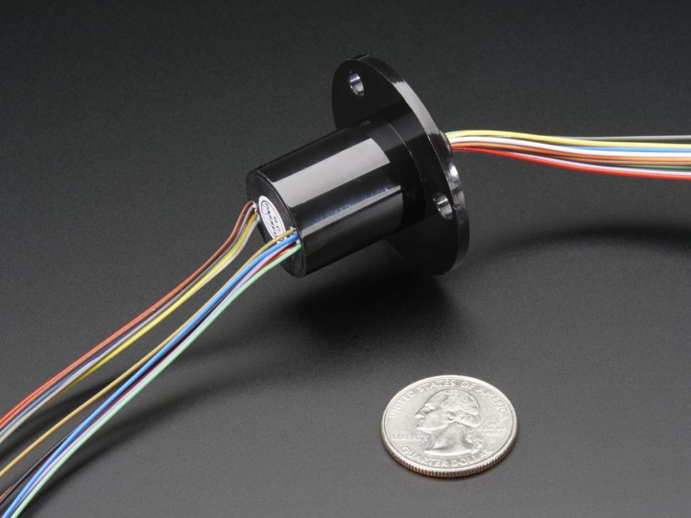 In de kunststof buis bevindt zich een vergulde sleepring, geschikt voor 12 draden. Deze 12 kleurgecodeerde draadsets zijn gemaakt van 28 AWG, wat zorgt voor continuïteit, ongeacht hoe de kabel is gedraaid. Elke draadset ondersteunt stromen tot 2 A bij 240 VAC of 240 VDC.