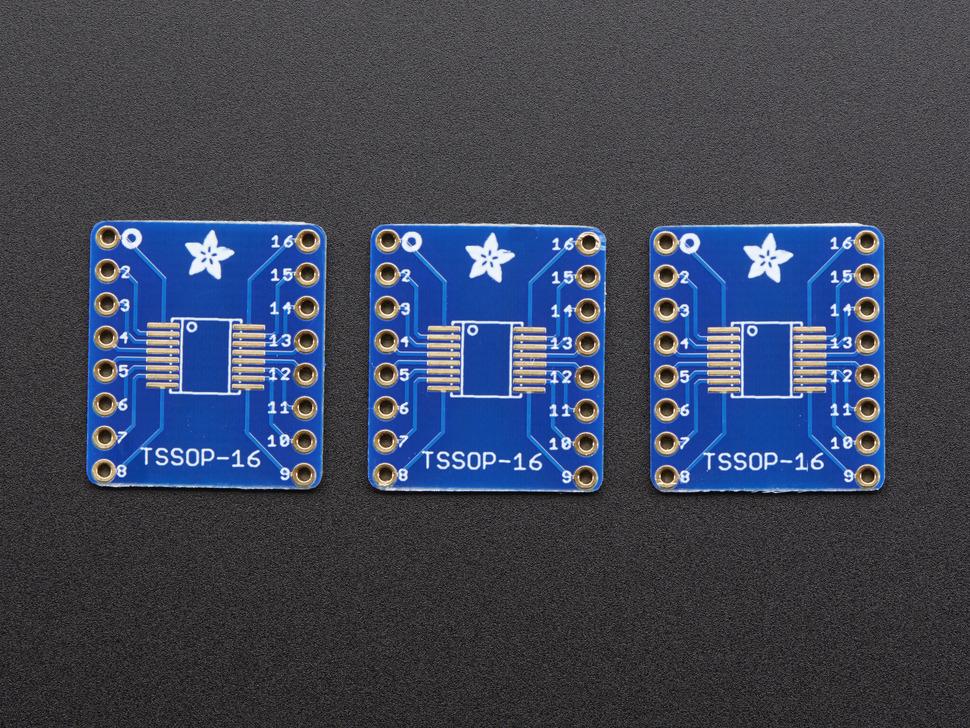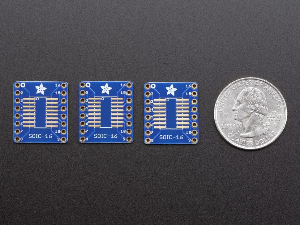 De ene kant heeft een 16-TSSOP-layout met sporen naar dubbele rijen gaten met een tussenruimte van 0,1 inch, terwijl de andere kant 16-SOIC ondersteunt. Soldeer uw chip en sluit hem moeiteloos aan op elk soldeerloos breadboard . Elke behuizing bevat drie identieke printplaten, geschikt voor SOIC- (smal, medium of breed) of TSSOP-configuraties.
