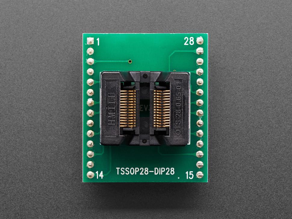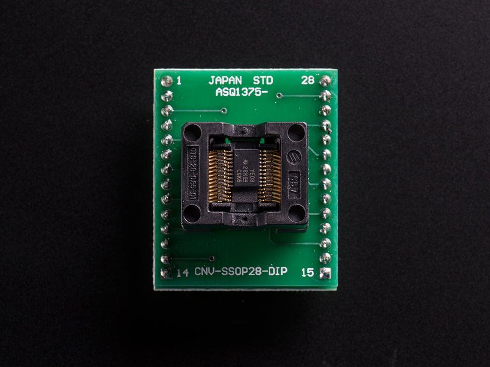 De socket wordt op een paar printplaten gesoldeerd, waardoor het in feite een 28-pins DIP met een tussenruimte van 0,6 inch wordt die vrij eenvoudig op een breadboard kan worden gemonteerd.