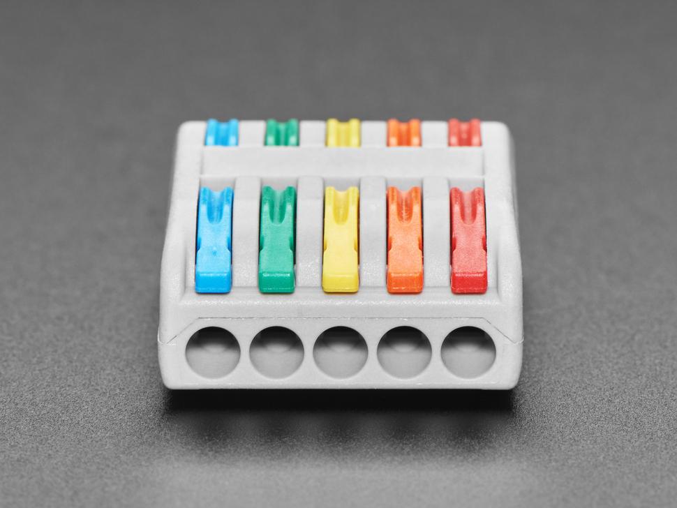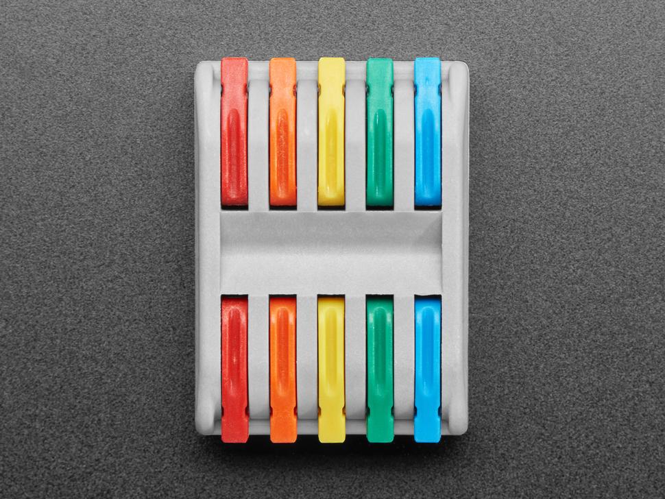 Klikblokken maken het snel bedraden van vrijhangende componenten eenvoudig, waardoor solderen niet meer nodig is. Ze presteren beter dan draadmoeren omdat ze herbruikbaar zijn en niet geknepen hoeven te worden. Dit blok heeft vijf kleurgecodeerde inputs en outputs – blauw, green , geel, oranje en rood – voor eenvoudige verbindingen.